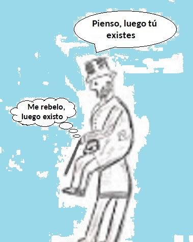 Pero este camino de auto-liberacion (para llegar al existir) conlleva sus ambivalencias y múltiples contradicciones, porque, ¿por qué para existir no seguir el desarrollo de tratar de llegar a ser como el personaje que él lleva sobre su espalda, el del "Pienso, luego tu existe"?